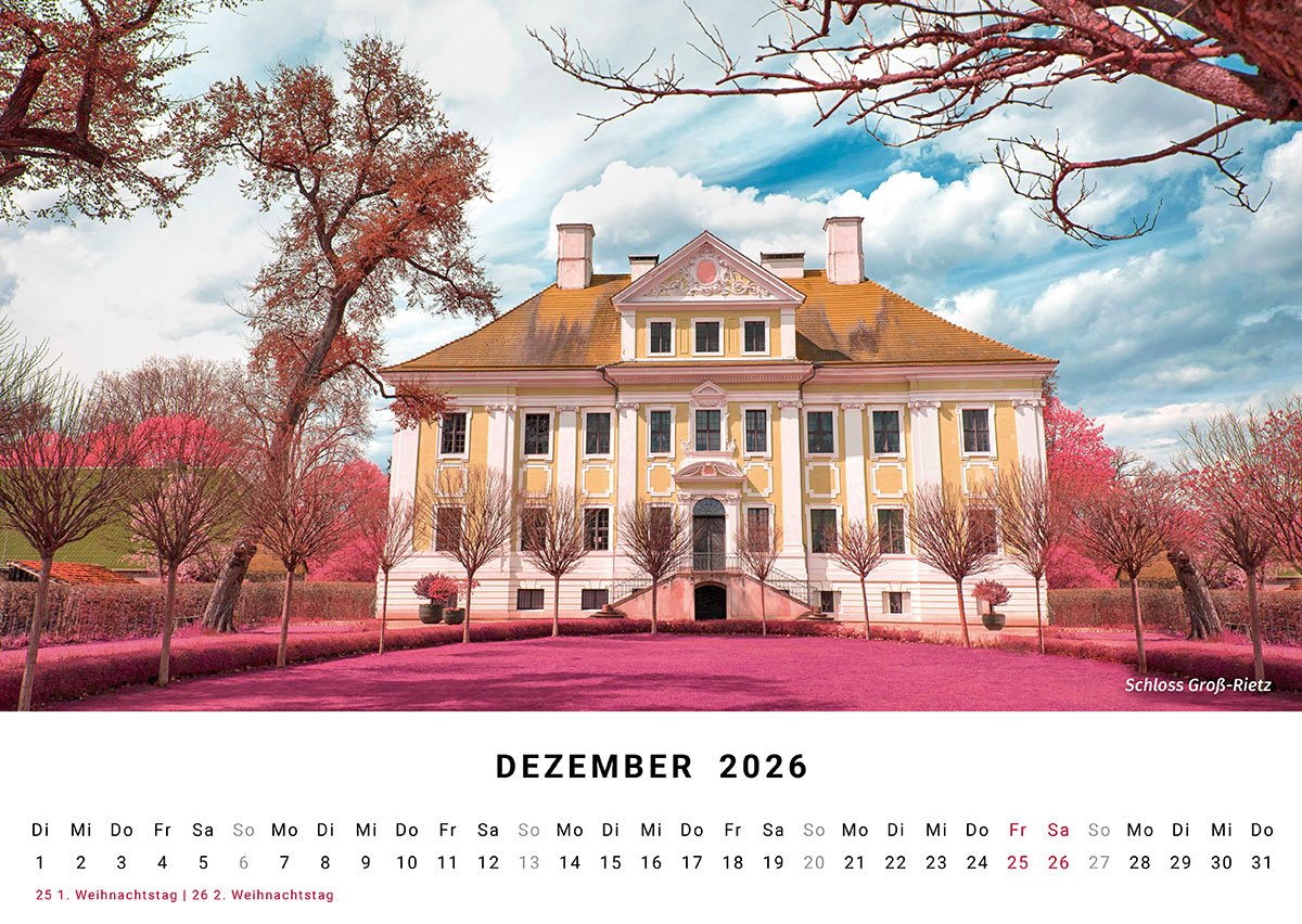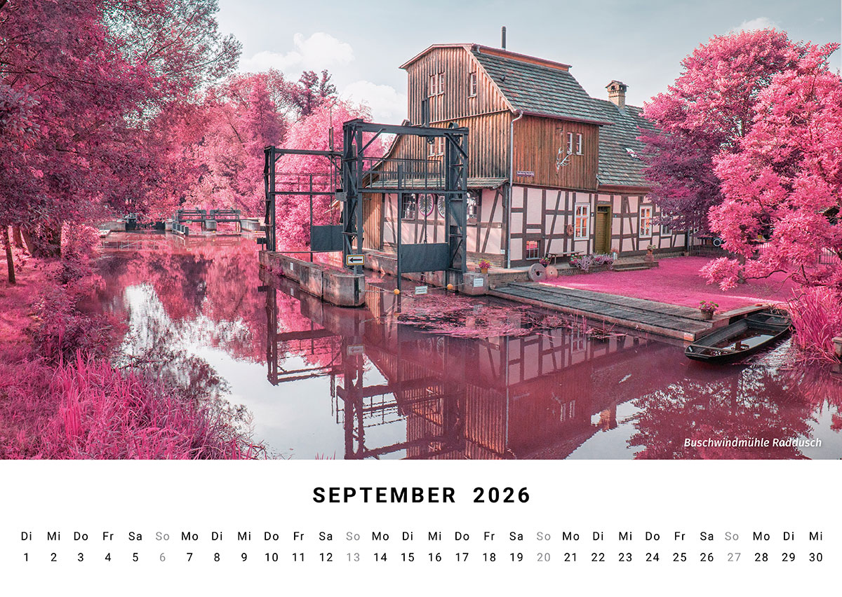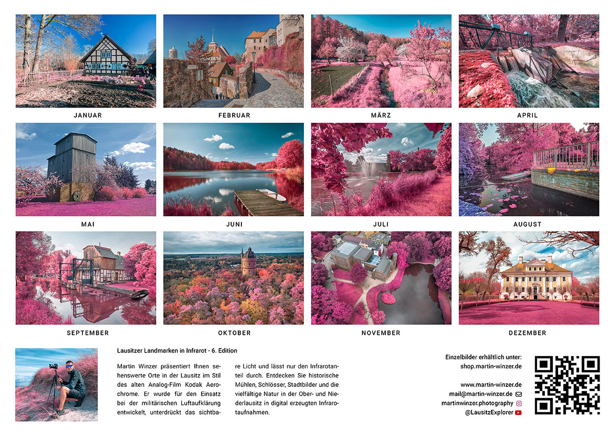 Der Kalender präsentiert Ihnen Cottbus und seine Umgebung im Stil des alten Analog-Film Kodak Aerochrome. Er wurde für den Einsatz bei der militärischen Luftaufklärung entwickelt und wird heute nicht mehr hergestellt. Entdecken Sie das prächtige Schloss Branitz in Cottbus, den Findlingspark Nochten oder die Bremsdorfer Mühle im Schlaubetal in digital erzeugten Infrarotaufnahmen.